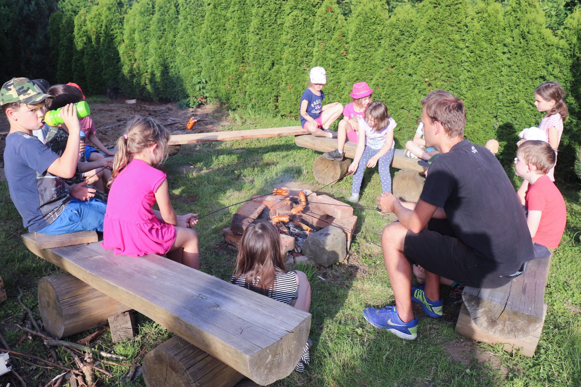 Na úpatí pískové hory na nás potom čekal zasloužený poklad! Ukrátili jsme si tak chvíli než pro nás byl připravený podvečerní oheň a opékání špekáčků. Každý z nás si dal! Velkou radost jsme měli i z opékání chleba, to byla taky pochoutka. Paní učitelka a lektor Mára naladili kytary a my se naučili nové písničky – třeba Okoř!